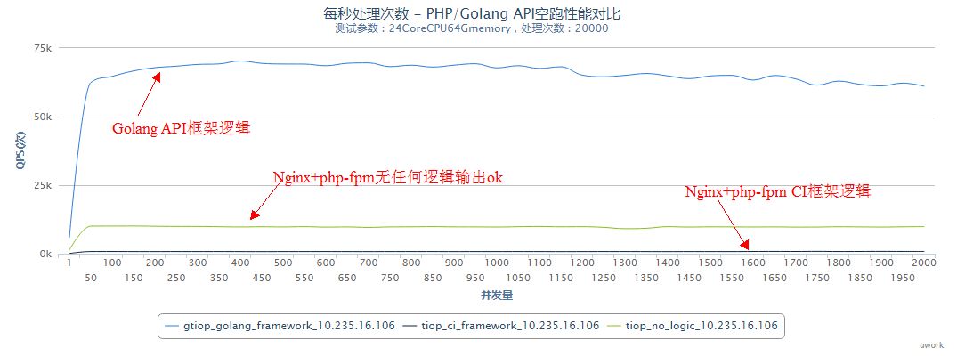 在Golang API框架中,当并发数>50时,处理QPS在6.5w/s附近波动。表现稳定,压力测试过程无报错。