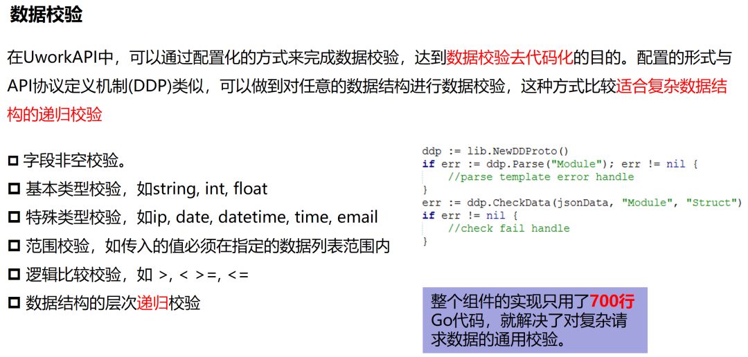 数据校验组件,可以通过一种数据模板的配置方式,使用特定的逻辑来完成通用校验,开发者只需要配置好相应的数据模板,进行简单的调用,即可完成整个校验过程。而对于这样一个通用性的数据校验组件,在GO语言中只用了不到700行的代码量就完成了整个构建。