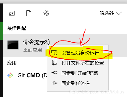 鼠标在命令提示符这里右键,选择“以管理员身份运行”