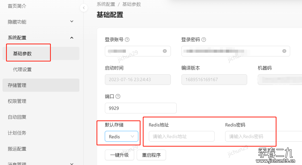 4.安装好redis后,进入傻妞后台-系统配置-基础参数,将默认存储改为redis,填入redis地址与密码保存重启傻妞。