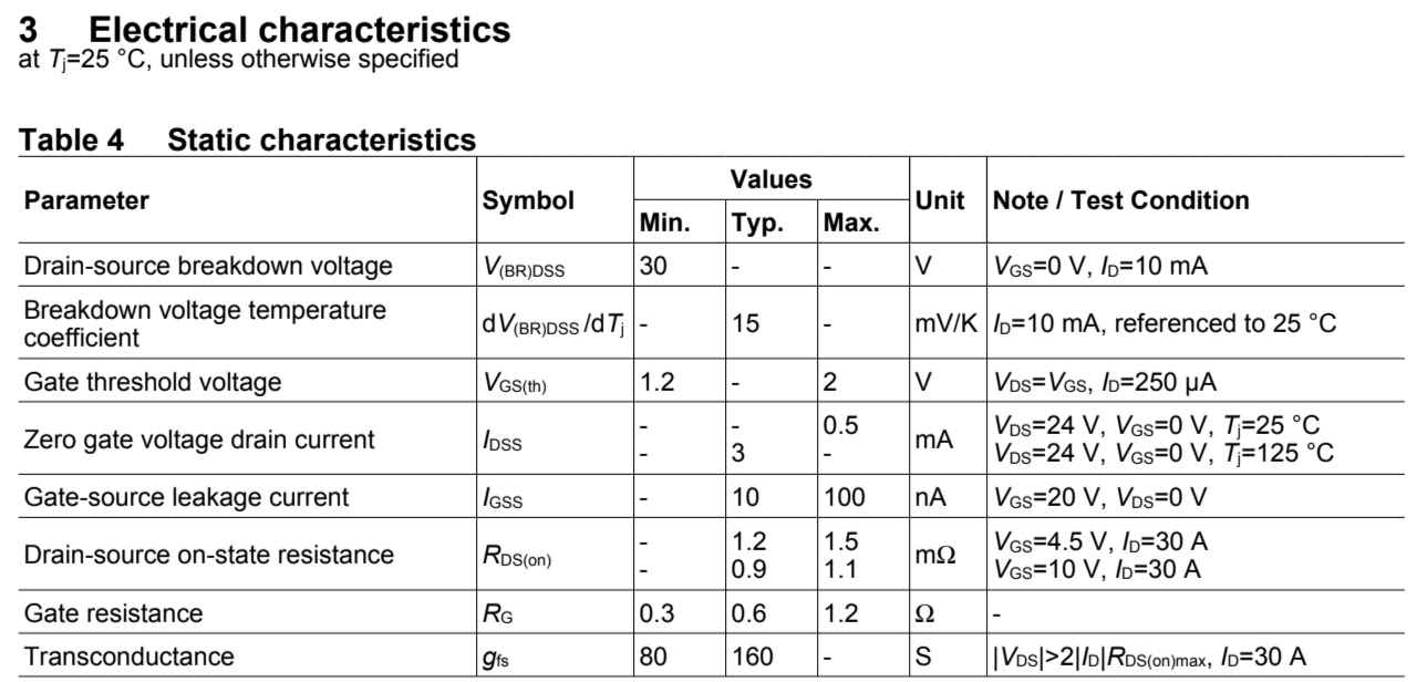 | Zero gate voltage drain current | \(\large I_{ DSS }\) | - | 3 | - | mA | \(\large T_{j}=125^{\circ}C,\ V_{DS}=24V,\ V_{GS}=0V\) |
