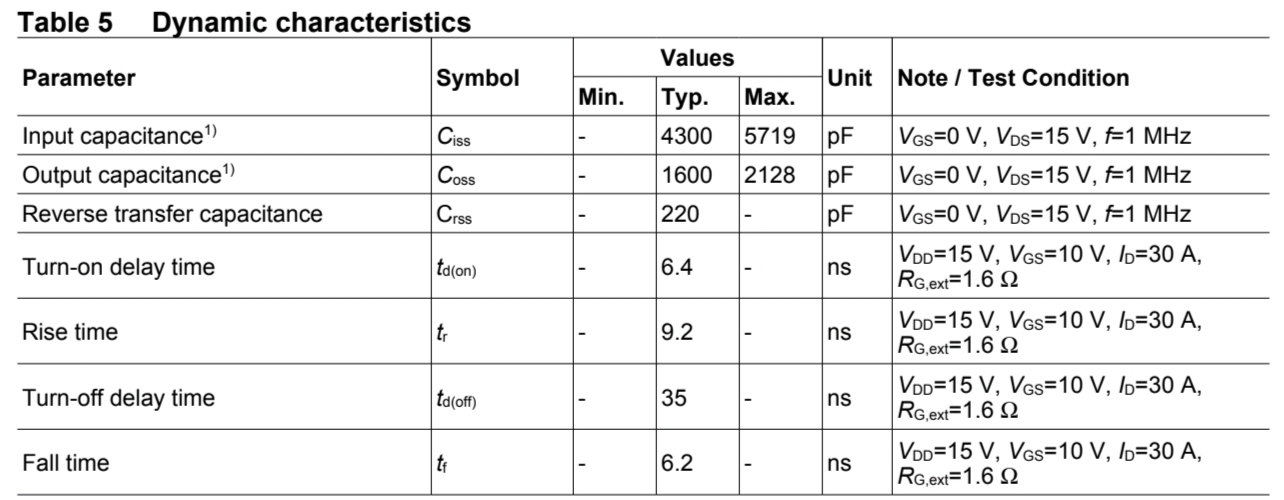 | Transconductance | \(\large g_{fs}\) | 80 | 160 | - | S | \(\large | V_{GS} | > 2 | I_{D} | R_{ DS(on)max },\ I_{D}=30A\) |