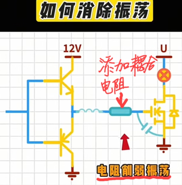 在FET的G极串接一个 "电阻" 作“阻抗耦合适配”产生适度阻尼防止振荡。
