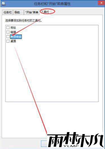 2、单击任务栏中的工具栏选项卡和``开始菜单属性对话框,在触摸键盘上单击以删除上一个对勾,然后单击确定,如图所示: