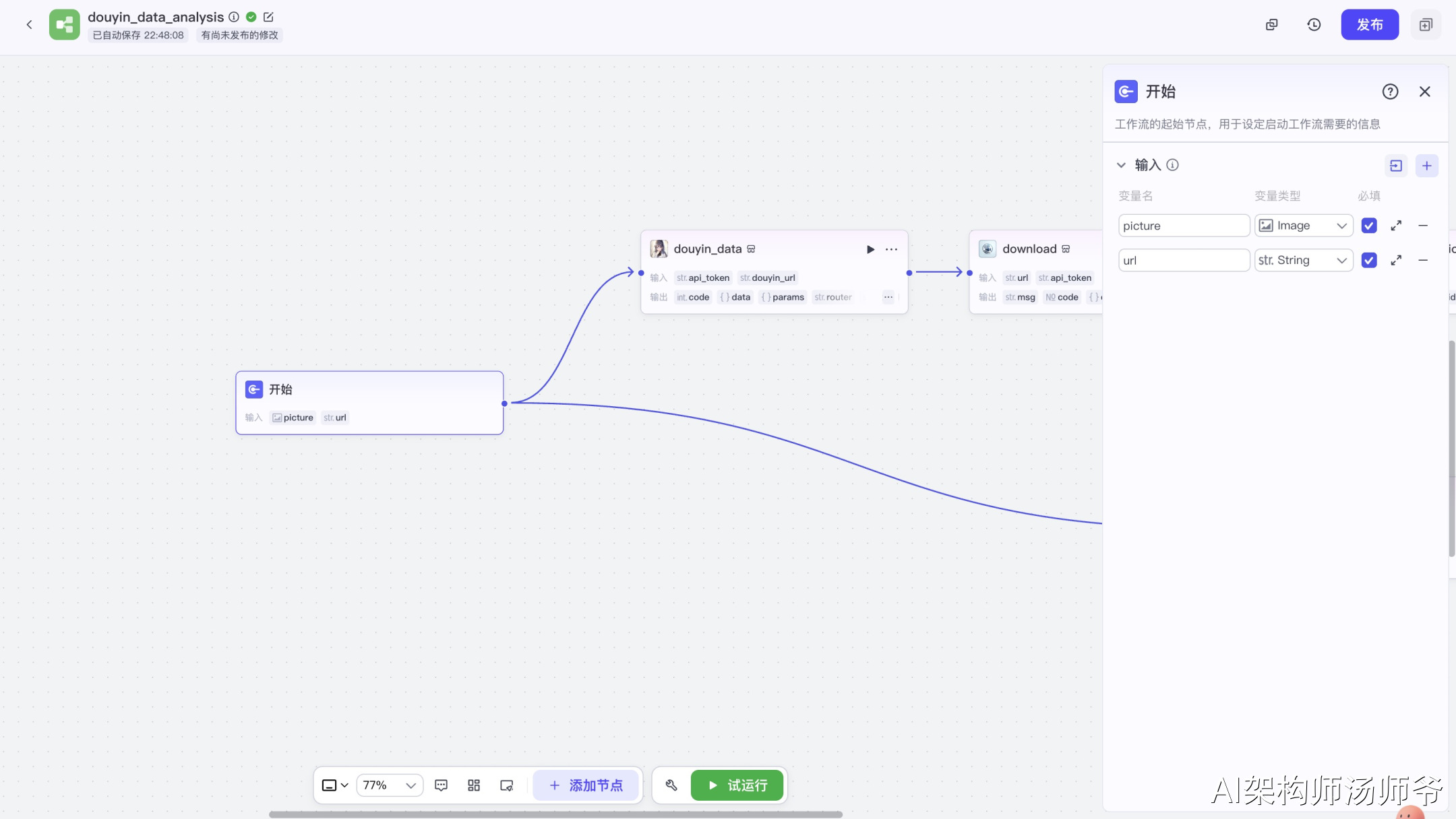 - url:从"根据视频分享链接,下载视频"节点的输出变量中,选择url。