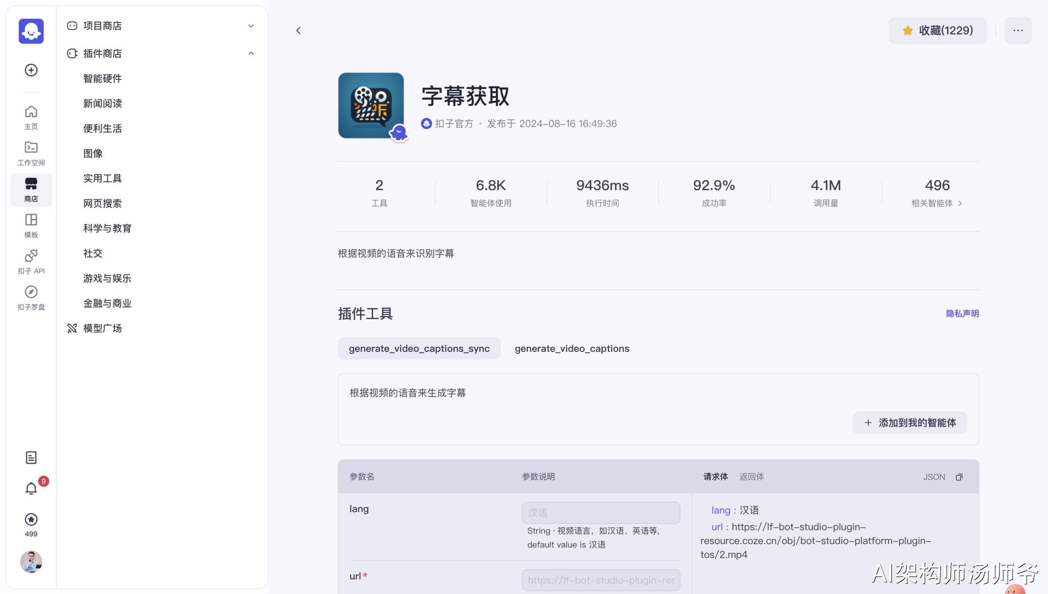 我们将使用【字幕获取】插件的“generate_video_captions_sync”功能。通过这个功能,我们可以根据视频的语音来识别文案。