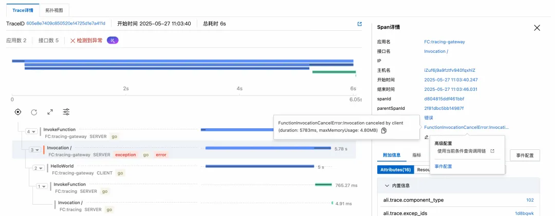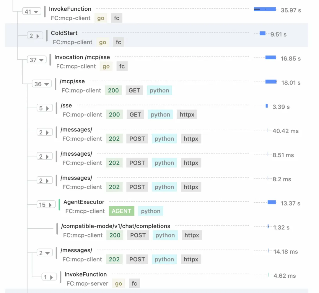函数计算集成链路追踪后,可以快速定位 Serverless 场景下的性能瓶颈。以一个langchain作为mcp-client端,高德天气查询作为mcp-server端为例。一次查询天气的调用链路如下:可以清晰的看到冷启动信息、sse连接,message连接,以及Agent的调用信息。