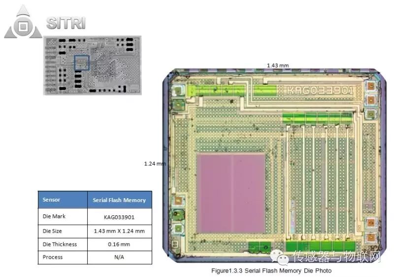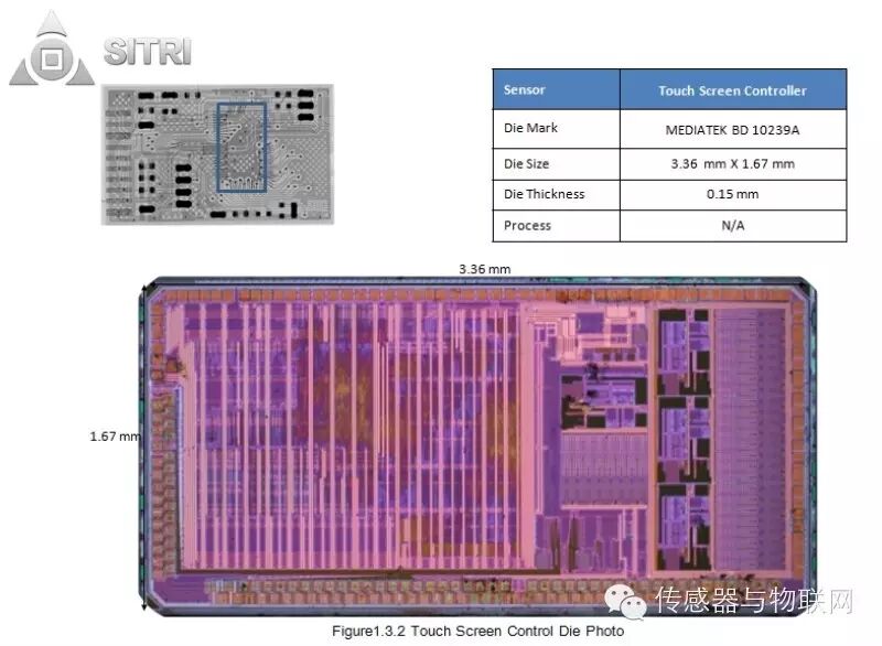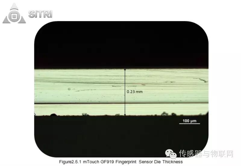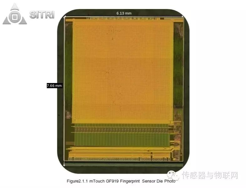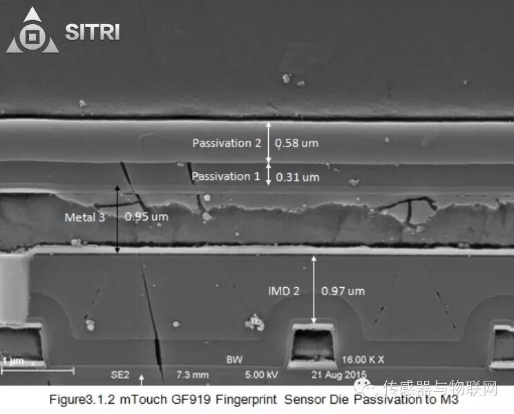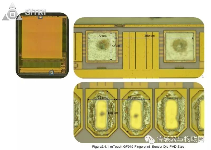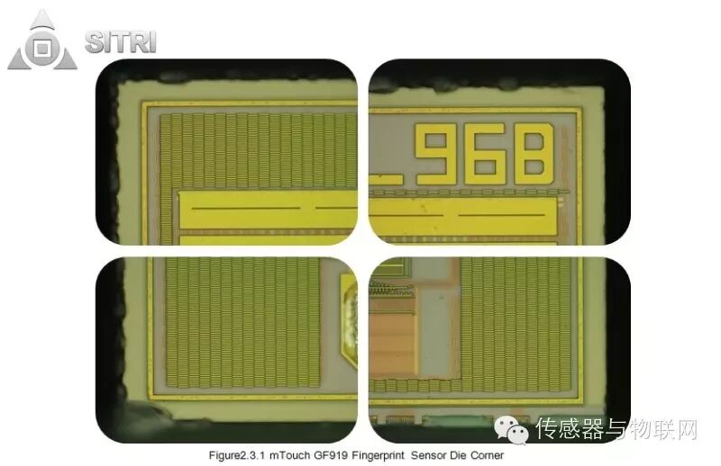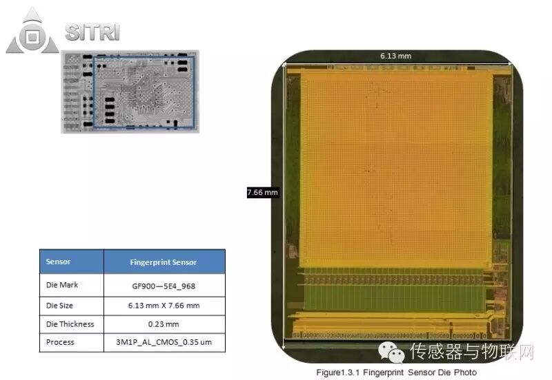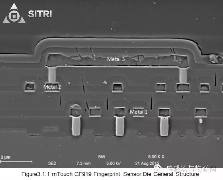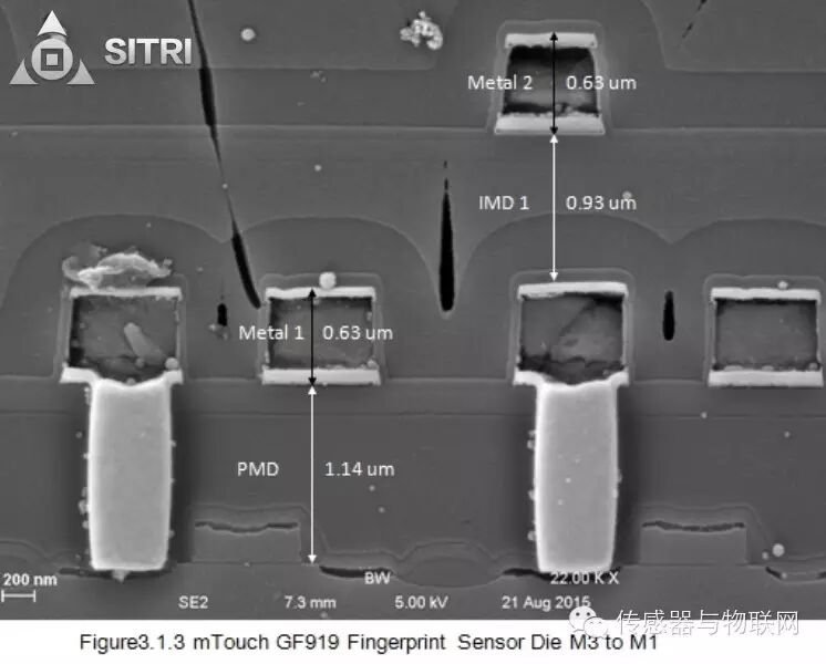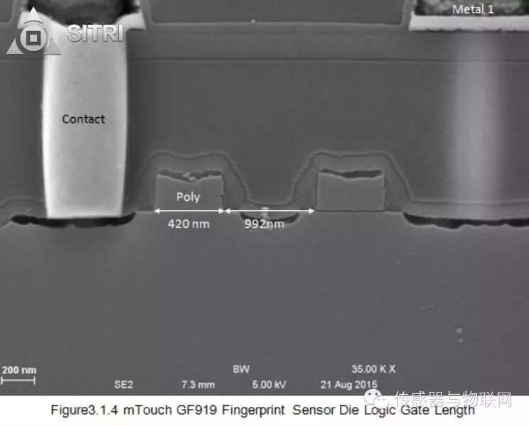 SITRI也对GF919里的指纹传感芯片做了基本纵向分析。这颗指纹传感芯片采用了3层平坦化铝布线制程,含有1层多晶的CMOS技术,工艺节点为0.35um。