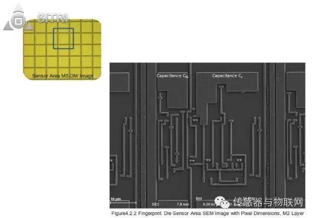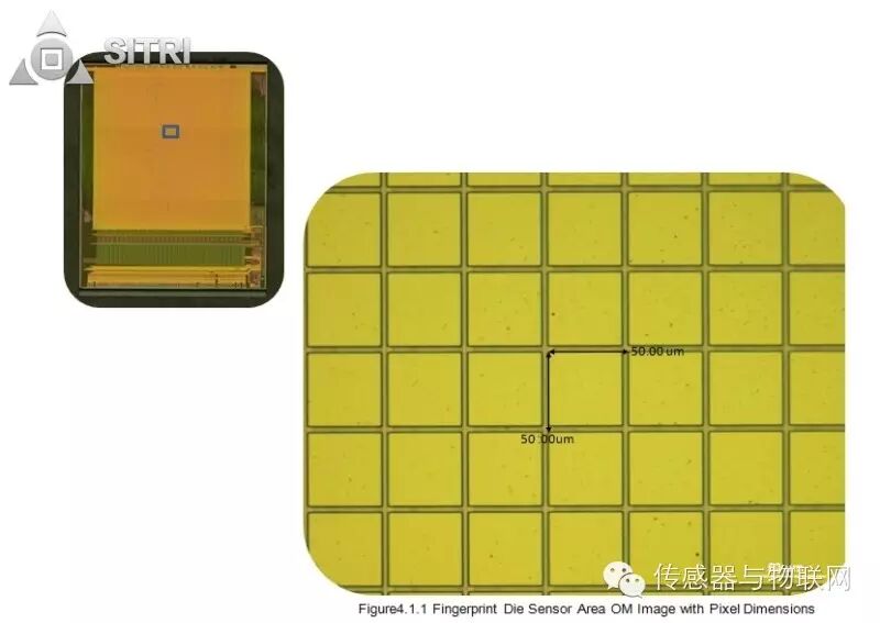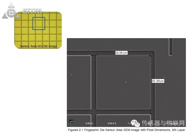从这颗指纹传感芯片的OM平面照片可以看出,其中感应像素区域占据了大部分空间,SITRI就这块区域做了部分平面分析。下图为放大的像素区域的OM和SEM照片,每一个像素的尺寸约为50 um X 50 um。