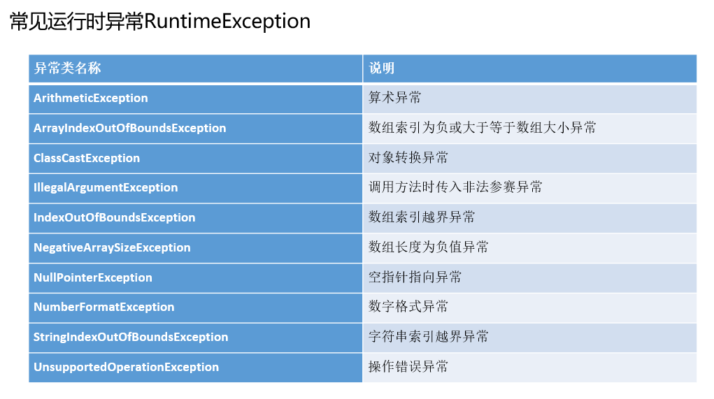 - Exception类异常是在程序中发生后可以进行捕获处理,处理后程序正常运行,从而保证程序的稳定性及健壮性。