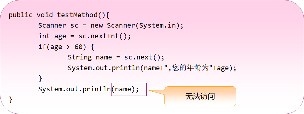 局部变量的作用域相对比较小,如方法的参数和方法内声明的变量都只在方法体内能够正常访问,超出方法范围后是无法访问到的。
