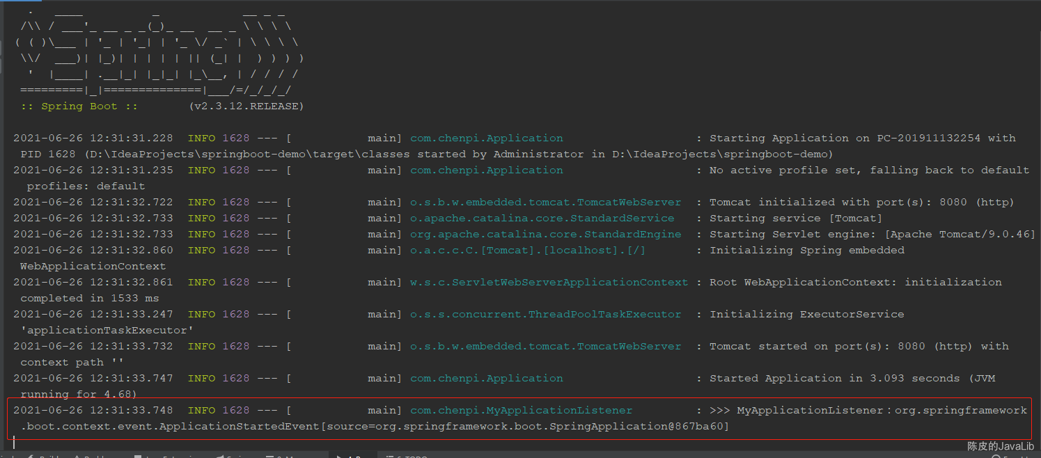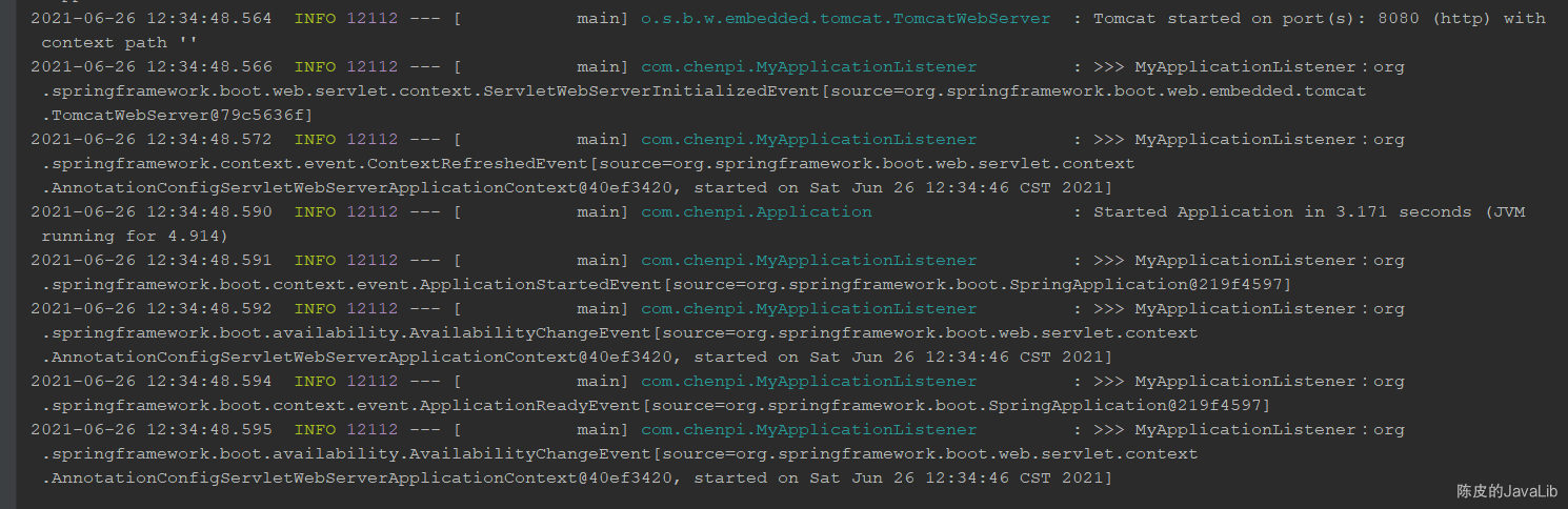 2021-06-26 16:15:09.606 INFO 10992 --- [ main] com.chenpi.MyApplicationListener : >>> MyApplicationListener:MyApplicationEvent{myField='我是自定义事件属性', source=我是事件源,项目启动成功后发布事件}