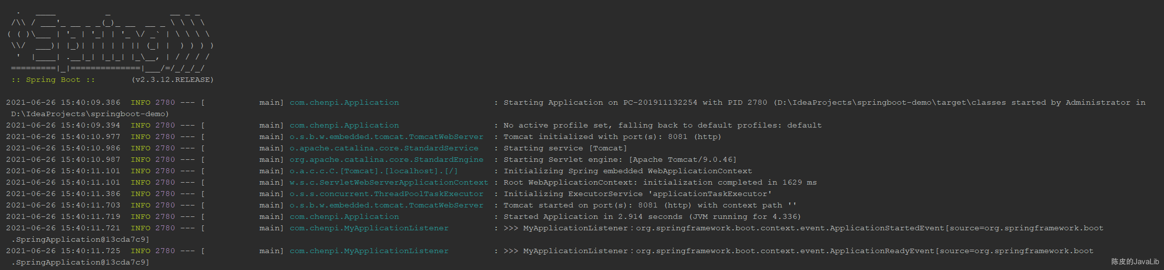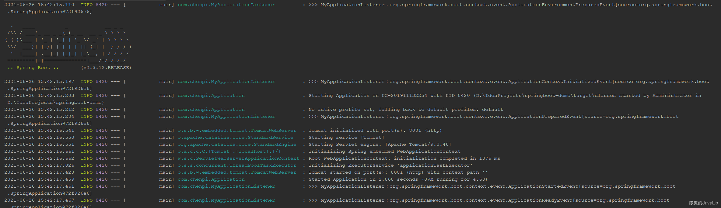 2021-06-26 20:34:27.990 INFO 12936 --- [nio-8081-exec-1] com.chenpi.MyService : >>> testEvent begin