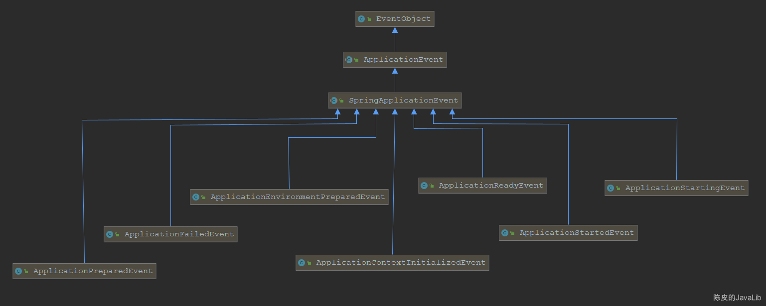 在 Spring 中,比较重要的事件类是 SpringApplicationEvent。Spring 有一些内置的事件,当完成某种操作时会触发某些事件。这些内置事件继承 SpringApplicationEvent 抽象类。SpringApplicationEvent 继承 ApplicationEvent 并增加了字符串数组参数字段 args。