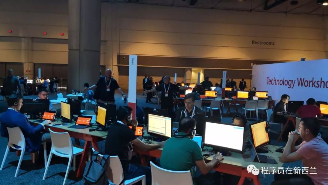如果大家以前参加过国内的Ignite或Tech Summit之类的,应该有所了解。Hands-On Labs即动手实验室,微软提供了一个虚拟环境和一些资源,如Azure订阅等,提前安装好Visual Studio等开发工具,供参与者学习使用。这是一个实践性很强的部分,今年还提供了排行榜功能,每个实验做完后,可以得到相应的积分,会场有大屏幕实时显示参与者的得分。我被安排在Apps区域,主要内容是使用UWP、Xamarin作为客户端,与App Service、API Management、Cognitive API和Data相结合的一些实验。所以这也很明显看出,微软不再重点针对具体的开发技术和目标平台,而是想方设法让开发者体验Azure的各项功能,这才是重点。其他还有Power BI,Office 365, Azure等区域,现场是这样的: