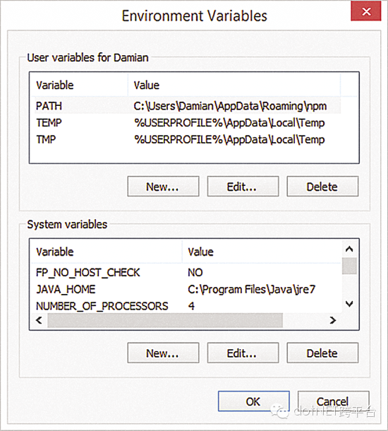 添加名为 JAVA_HOME 的环境变量。它的值将是您在其中安装 Java 的文件夹路径(例如,C:\Program Files\Java\jre7),如图 1 中所示。