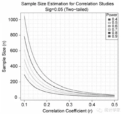n是观测数目,r是效应值(通过线性相关系数衡量),sig.level是显著性水平,power是功