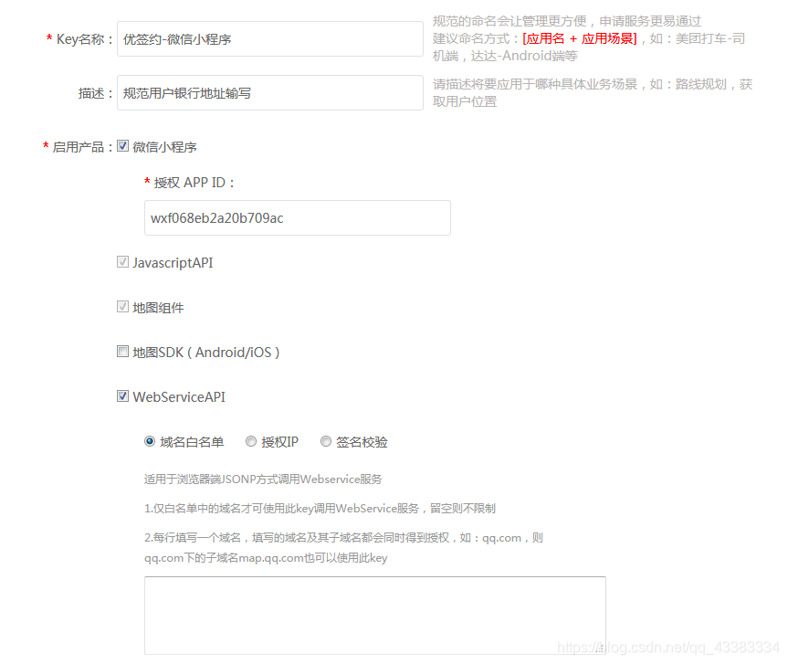 注: 微信小程序使用的时候,WebServiceAPI 域名白名单不能配置,否则会报错