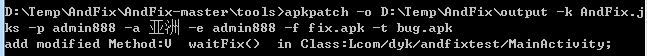 apkpatch -o D:\Temp\AndFix\output -k AndFix.jks -p admin888 -a 亚洲 -e admin888 -f fix.apk -t bug.apk