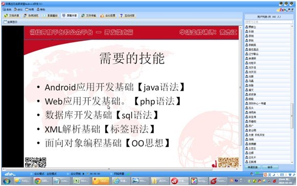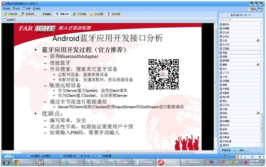 名家大讲堂Android开发篇共两讲,报名人 数600余人,最高同时在线用户高达260人。两场均由华清远见的金牌讲师担纲主讲,讲师结合多年的项目研发经验,分别从微营销的开发、应用和 Android蓝牙设备访问技术方面进行系统的介绍。通过大量的日常生活中的举例和实际项目经验,对知识点进行深入浅出的讲解。不仅能够让技术工作者得到 实用的知识,也能让入门者更容易理解和记忆,得到了众多学员的热烈好评!