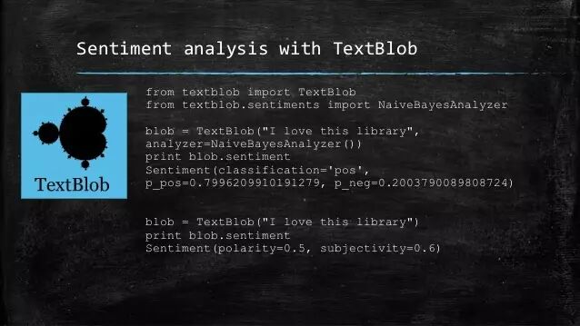TextBlob是处理文本数据的一个Python库。它为深入挖掘常规自然语言处理提供简单易用的API,例如词性标注(part-of-speech tagging)、名词短语提取(noun phrase extraction)、情感分析、文本分类、机器翻译等等。