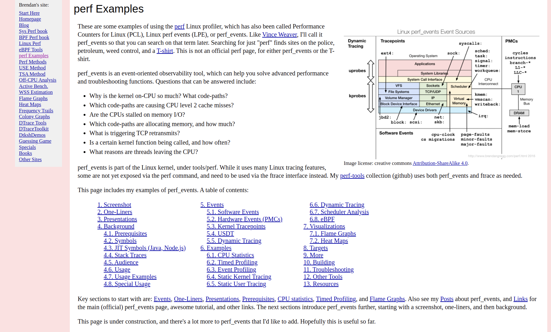 上面介绍了perf的原理,“根据 tick 中断进行采样,即在 tick 中断内触发采样点,在采样点里判断程序当时的上下文”,我们可以改变采样的触发条件使得我们可以获得不同的统计数据,例如 以时间点 ( 如 tick) 作为事件触发采样便可以获知程序运行时间的分布;以 cache miss 事件触发采样便可以知道 cache miss 的分布,即 cache 失效经常发生在哪些程序代码中。如此等等。
