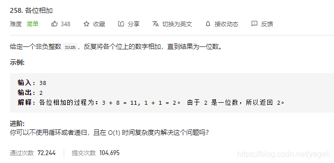 - LeetCode 258 Add Digits(数字相加,数字根)