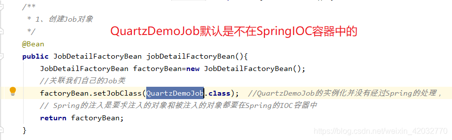 因此我们需要手动的把QuartzDemoJob类注入到SpringIOC容器中。