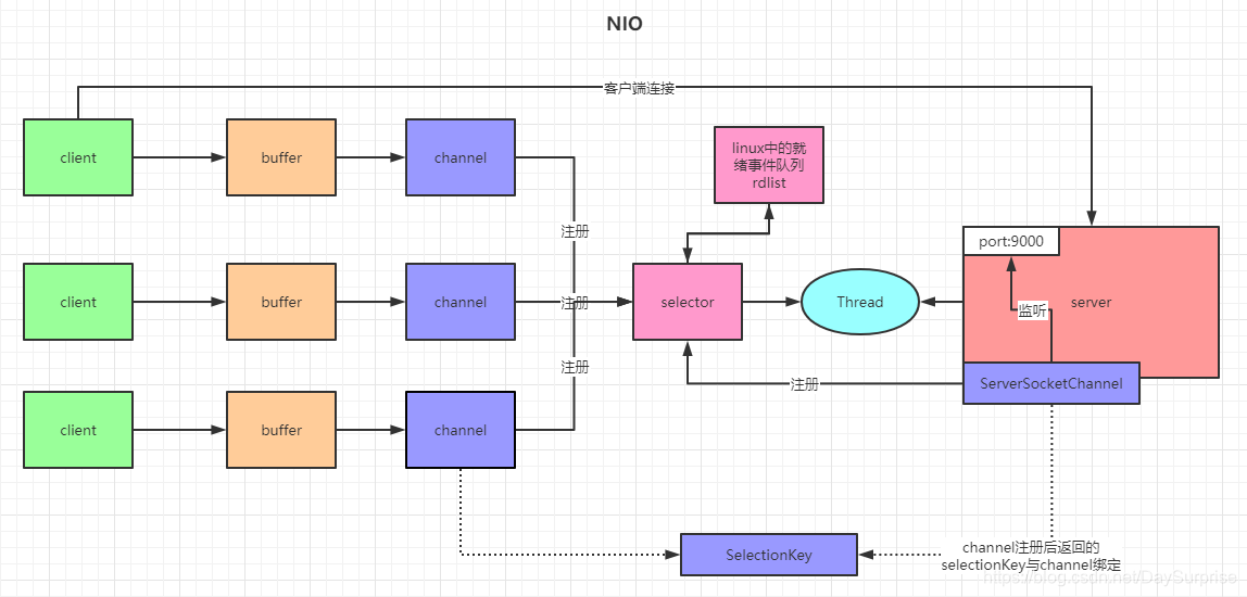 static List<SocketChannel> channelList = new ArrayList<>(); public static void main(String[] args) throws IOException, InterruptedException { // 创建NIO ServerSocketChannel,与BIO的serverSocket类似
