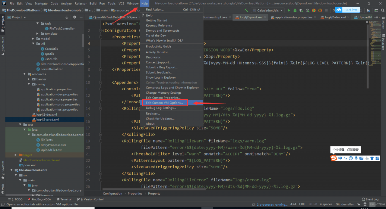成功进入 IDEA 以后,我们随便创建一个项目/或者打开个旧的项目,点击顶部的 Help 菜单 -> Edit Custom VM Options: