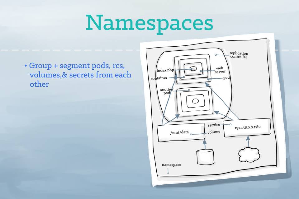 Namespace是Kubernetes内的分组机制。Service,pod,replication controller和volume可以很容易地和namespace配合工作,但是namespace为集群中的组件间提供了一定程度的隔离。