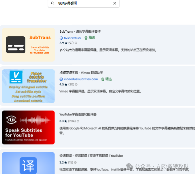 有没有chrome浏览器插件支持实时在线翻译英文到简体中文的?迅速在chrome商店中搜索了一下。果然,看到了很多视频字幕翻译的插件: