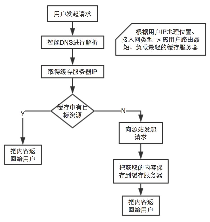 当用户发起访问时,被智能DNS定位到离他较近的缓存服务器,如果用户所请求的内容刚好在缓存里面,则直接把内容返还给用户;否则,缓存服务器向邻近的缓存服务器或直接向源站抓取内容,再返还给用户