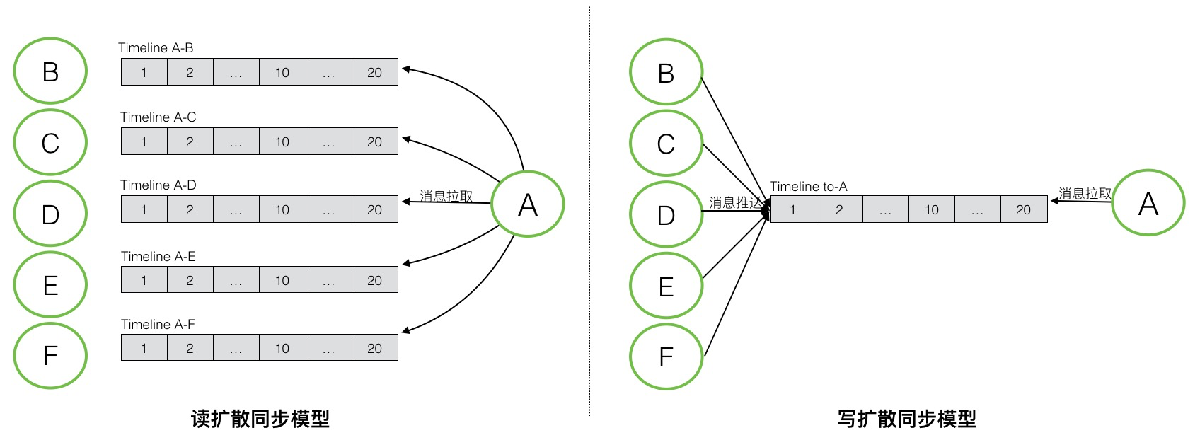 消息同步模型会比消息存储模型稍复杂一些,消息的同步一般有读扩散(也叫拉模式)和写扩散(也叫推模式)两种不同的方式,分别对应不同的Timeline物理模型