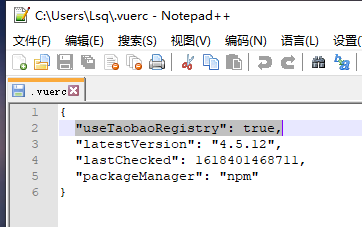 2、在C盘用户目录下/.vuerc文件中将”useTaobaoRegistry”: true设置为false