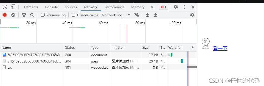 发现img应用的资源,只要页面加载就会下载下来,而a标签引用的资源没有被下载下来,我们只有在点击“看一下”文字的时候,我们才能访问资源。