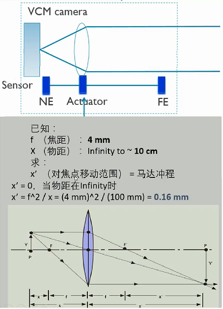 马达的起始位置一般在焦距处,由上面光学数学关系可知,焦距处可以清楚的对远处的物体成像。但是物体如果很近比如20cm,那vcm该如何驱动呢? 根据 , 可知当物距为(Xo+f)时,像距为(Xi+f), 则vcm需要向物体方向移动Xi。