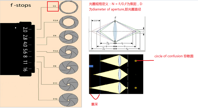 其中:N为光圈规格,c为弥散圆直径,s物距,f焦距,f焦距。