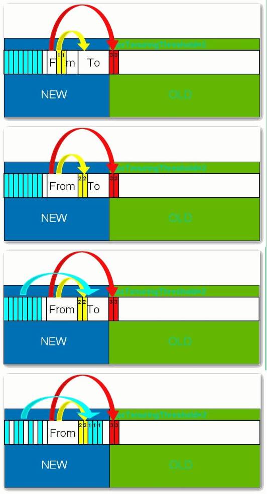 一般情况下,当新对象生成,并且在Eden申请空间失败时,就会触发Scavenge GC,对Eden区域进行GC,清除非存活对象,并且把尚且存活的对象移动到Survivor区。然后整理Survivor的两个区。这种方式的GC是对年轻代的Eden区进行,不会影响到年老代。因为大部分对象都是从Eden区开始的,同时Eden区不会分配的很大,所以Eden区的GC会频繁进行。因而,一般在这里需要使用速度快、效率高的算法,使Eden去能尽快空闲出来。