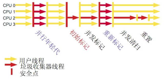 并发收集器主要减少年老代的暂停时间,他在应用不停止的情况下使用独立的垃圾回收线程,跟踪可达对象。在每个年老代垃圾回收周期中,在收集初期并发收集器 会对整个应用进行简短的暂停,在收集中还会再暂停一次。第二次暂停会比第一次稍长,在此过程中多个线程同时进行垃圾回收工作。
