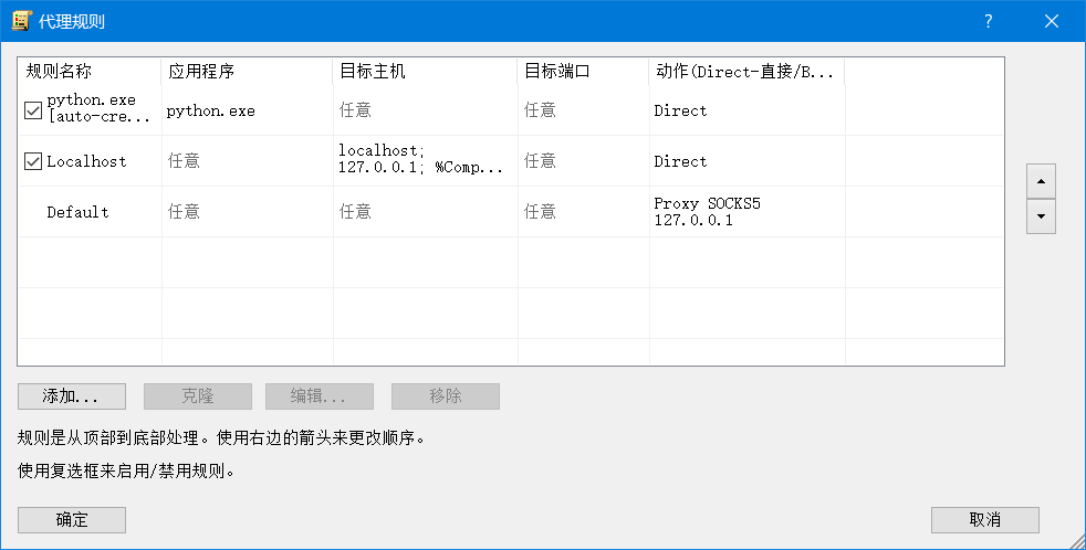 需要注意的是python.exe一定不能设置为经过代理,那样会产生死循环的。规则制定好了,只要打上勾就表示应用该规则。我上面贴的图片只是一个参考。