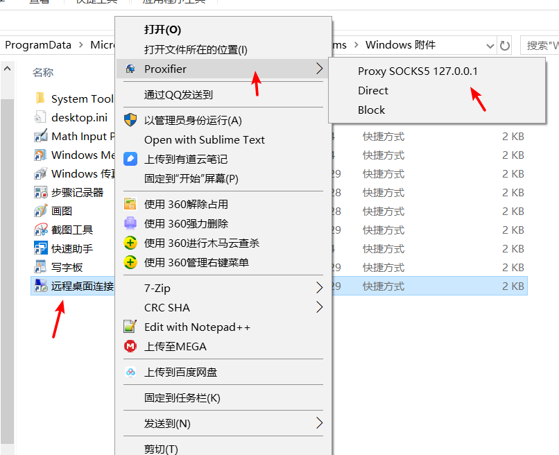 右击“mstsc.exe”,选择“proxifier”-->proxy socks5 127.0.0.1进行远程连接