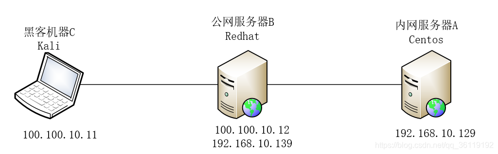 现在我们有这么一个环境,我们拿到了公网服务器B的权限,并通过公网服务器B进一步内网渗透,拿到了内网服务器A的权限。但是现在我们想要在自己的Kali机器上,获取内网服务器A的一个稳定持久的SSH权限。那么,我们可以通过SSH反向隧道,来得到内网服务器A的一个SSH权限。我们可以将内网服务器A的22端口远程转发到公网服务器的1234端口。