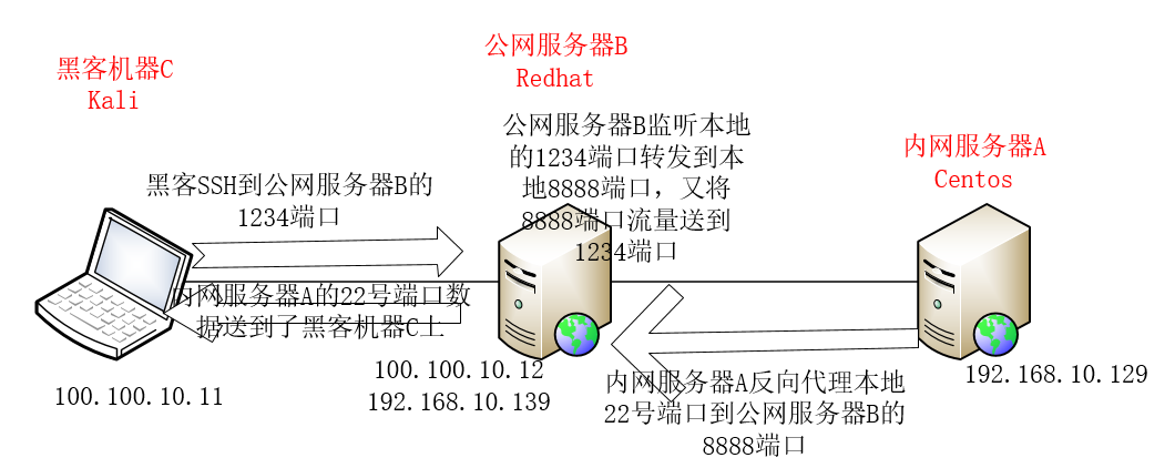 所以最终流量的走向是这样的:黑客SSH到公网服务器B的1234端口,公网服务器B监听了本地的1234端口,将流量转发到本地的8888端口,于是内网服务器A将本地的22号端口反向代理到了公网服务器B的8888端口,公网服务器B又将8888端口的流量转发到了本地的1234端口,所以黑客SSH连接到了内网服务器A。