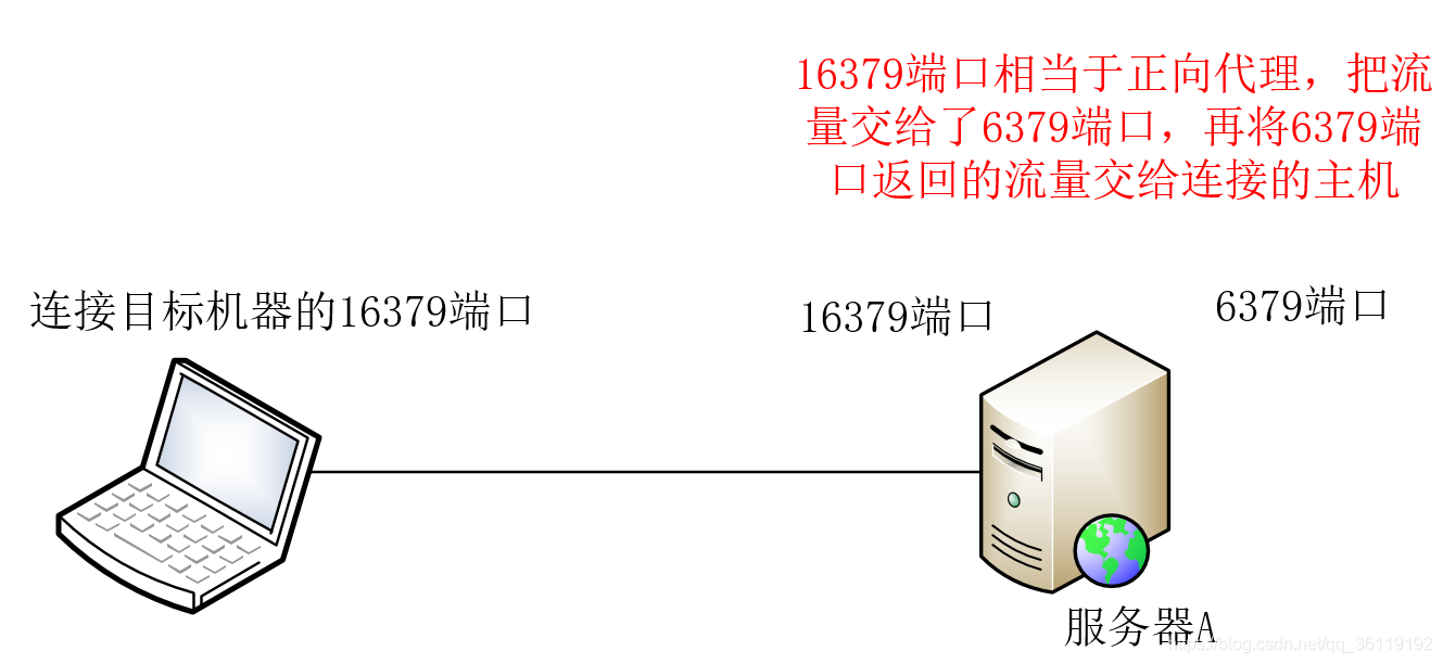现在我们有这样一种情景,服务器A上有Redis数据库,并且我们知道Redis数据库的密码。但是Redis数据库只监听本地的6379端口,也就是127.0.0.1:6379,现在我们需要连接该Redis数据库,读取其中的数据。那么,我们就可以用SSH做本地端口转发,在服务器A上监听16379端口,当连接该主机的16379端口时,16379端口相当于正向代理,将我们的流量给本地的6379端口,再将6379端口返回的流量给我们的主机
