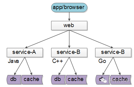 服务化的一个好处就是,不限定服务的提供方使用什么技术选型,能够实现大公司跨团队的技术解耦,如下图: