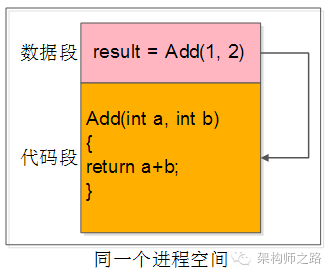 这段代码的时候,我们知道,我们传入了1,2两个入参数,调用了本地代码段中的一个Add函数,得到了result出参。此时,传入数据,传出数据,代码段在同一个进程空间里,这是本地函数调用。