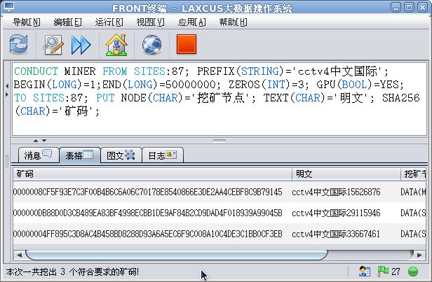 目前我已经在Laxcus大数据平台上开发了许多应用,比如下面这个挖矿的程序,利用分布编程框架,还有计算机集群和GPU的支持,很快就能挖出我要的矿码。