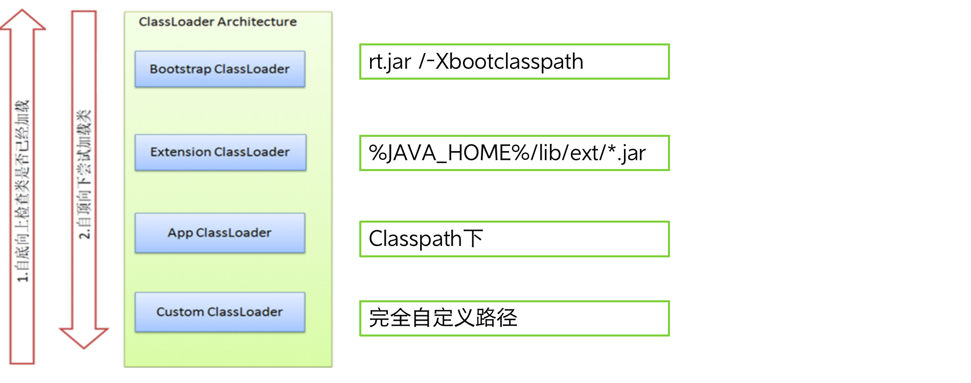 加载的方法是从上往下的,并不是APPClassLoader找不到就让APPClassLoader做加载,先由BootsTrapClassLoader做加载,如果BootsTrapClassLoader加载成功了,下面的ClassLoader就不做事情,如果BootsTrapClassLoader没有加载成功,就让ExtensionClassLoader,做加载,如果ExtensionClassLoader没有加载成功,再让APPClassLoader加载。由此可见,如果一个class由BootsTrapClassLoader加载之后,再去询问,在ExtensionClassLoader中是没有的,因为不是第一个尝试加载的ClassLoader