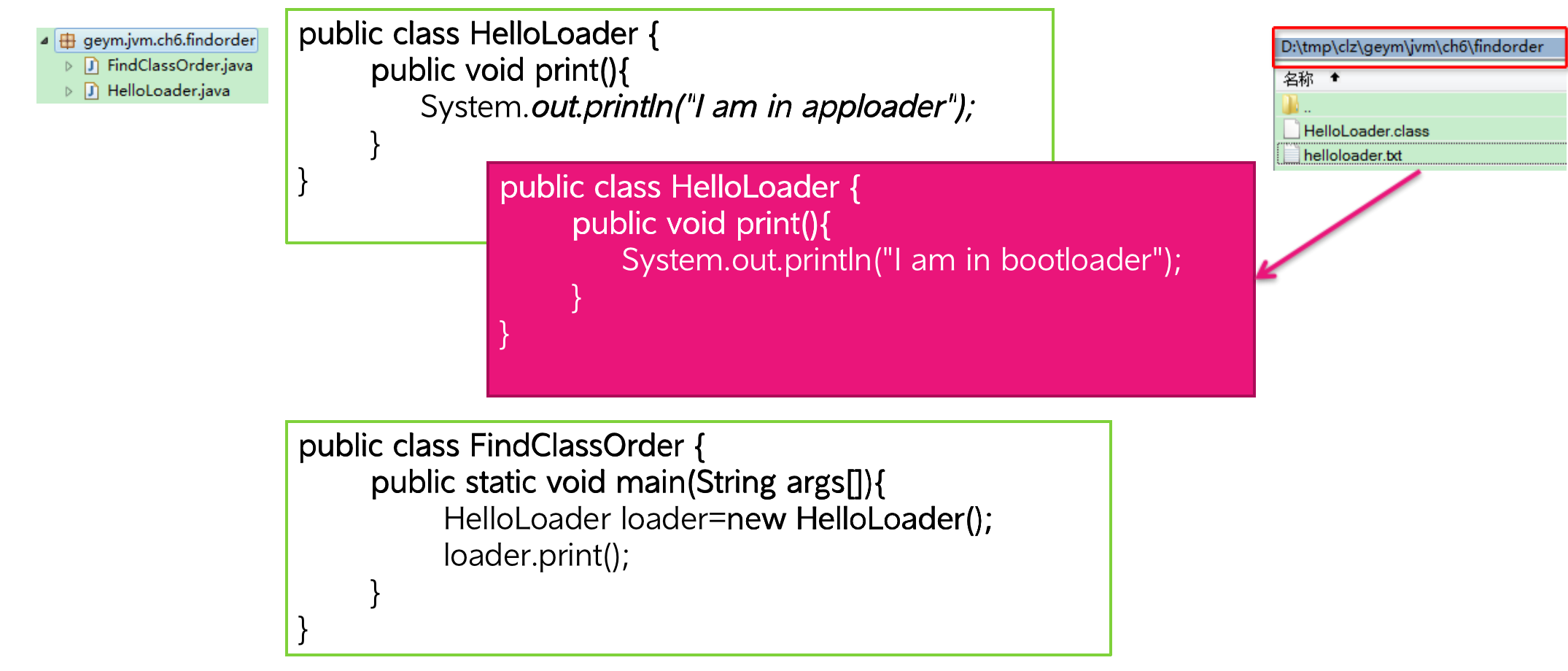 描述:起初是左边的HelloLoader在如图的包下面,之后再在本机的clz目录下新建一个HelloLoader(红色部分)